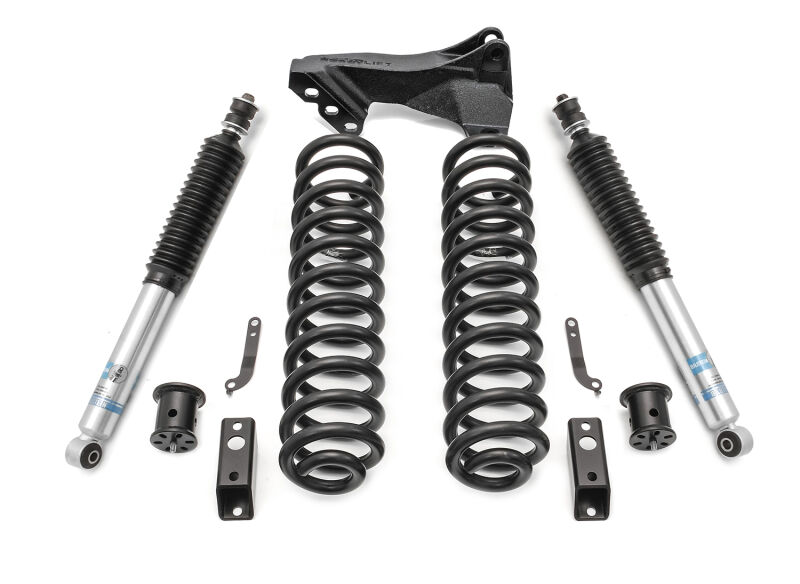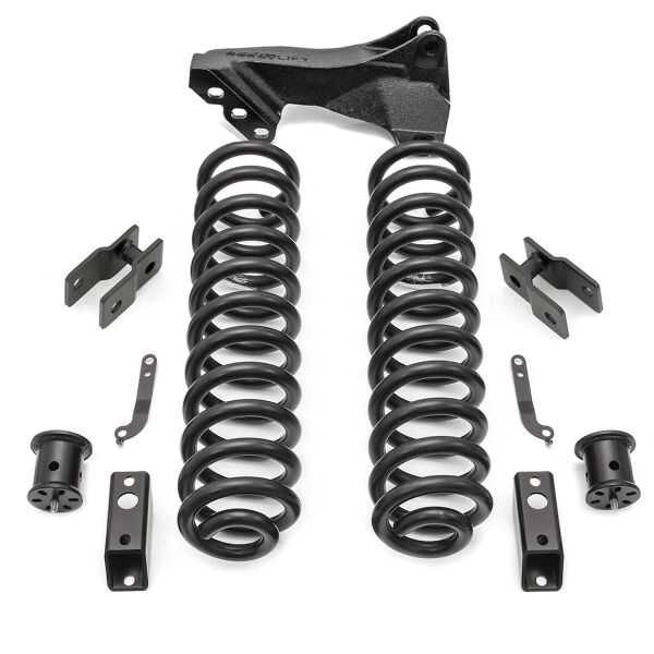 ReadyLIFT Suspension now offers a 2.5" Lift Coil Spring Front leveling Kit including our popular front track bar relocation bracket made to fit 2011-2019 Ford Super Duty F250/F350/F450 4WD diesel trucks. This gives Super Duty owners an excellent alternative for lifting the front of your truck while providing the flexibility of selecting your own aftermarket front shocks.. This great new front leveling system will raise the front of your 2011-2019 4WD Super Duty truck 2.5" while including added value components such as the our track bar relocation bracket.. The 46-2728 coil spring system allows for increased tire sizes and widths along with providing improved ground clearance and a more commanding view of the road. This premiere leveling kit easily allows for 35" tall tires. The 46-2728 coil spring leveling kit delivers a great ride ride and handling performance! The key ingredients to improving your ride are the new specially engineered coil springs teamed with a track bar relocation bracket! This combination is more than just a leveling kit. This is a performance and ride enhancing kit that will really surprise you at how well it rides and performs both on and off road. The ReadyLIFT 2.5" Coil Spring Front leveling kit system for 2011-2019 Ford Super Duty F250/F350/F450 trucks also included model-specific brake line extension brackets, Our time-tested bump stop extension brackets and new front sway bar frame mount extension brackets to keep the factory sway bar where is supposed to be. If you want tough looks and a smooth but controlled ride, then you want the new 46-2728 Coil Spring Leveling Kit System. Your truck will thank you! NOTE: Super Duty trucks, depending on factory spring rate, may experience a minor variation in lift height. Final lift height may vary from 1.5" to 2.5". NOTE: 2011-2016 F250 vehicles may require a rear block kit to achieve a level stance. NOTE: Not recommended for TREMOR editions.