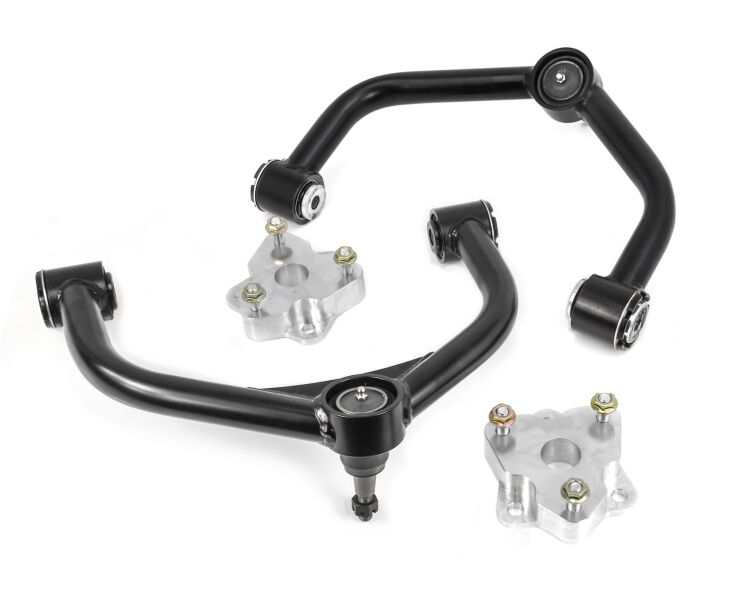 For use on New body style Ram 1500 4WD. Not for use on classic body style Ram 1500. Also fits Rebel Edition ReadyLIFT is excited to announce that we now offer several different leveling and lift solutions to properly enhance the stance and driving quality of the 2019-2023 Ram 1500 truck 4WD. Like the body design, the suspension design of the 2019-2023 Ram 1500 4WD features some unique design elements that differ from the previous generation Ram. These differences were tackled by our engineers as a result, we now offer a CNC machined billet aluminum construction leveling kit to properly level these new Ram 1500 4WD trucks. The 66-1921 kit provides 2" of front leveling lift in the form or our popular CNC machined billet aluminum top mount strut extension. The 2019-2023 Ram now comes with a composite upper control arm with a sheet metal cover. Our engineers determined the stresses around the ball joint would be too great for a traditional strut extension leveling kit. To add strength and security to your new leveling set up, we have developed a new heavy-duty DOM tube steel upper control arm with corrected ball joint angle cups for proper pivot angle. Our 66-1921 2" front leveling kit will get the job done right and affordably. This kit is not for use on air-suspension equipped trucks.