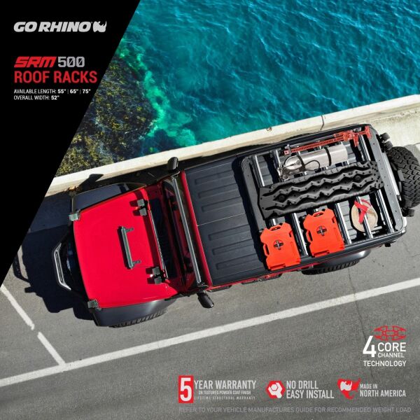 The Go Rhino SRM500 Roof Rack is a platform roof rack that is essential for the off-road and overlanding enthusiast. The flat mounting surface was designed for rooftop tent and the aircraft-grade aluminum construction with custom injection molded, reinforced nylon junctions offer both strength and weight savings. The SRM500 is equipped with Go Rhino’s exclusive 4-CORE aluminum bars, the extruded track system that works with any 1/4x20 hex bolt and provides unlimited mounting options for gear and trail tools. The SRM500 is 52 inches wide, and 55" front-to-back, and can be mounted on any vehicle’s OE crossbars with the included Rhino Clamp system. Other mounting options are also available. SRM 500 come with a Limited Lifetime warranty on materials and construction and a 5 year warranty on the Textured Black Finish.